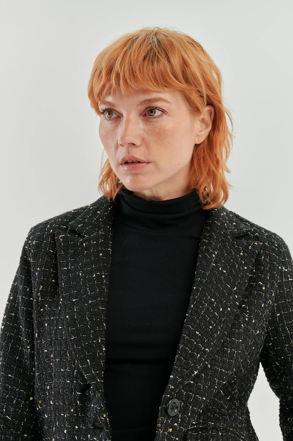 Descubrí el Blazer Tweed Coco, una prenda que combina elegancia y estilo con un toque único. Este blazer cuenta con detalles de hilado y lentejuelas que lo hacen ideal para cualquier ocasión, desde una reunión formal hasta un evento especial.