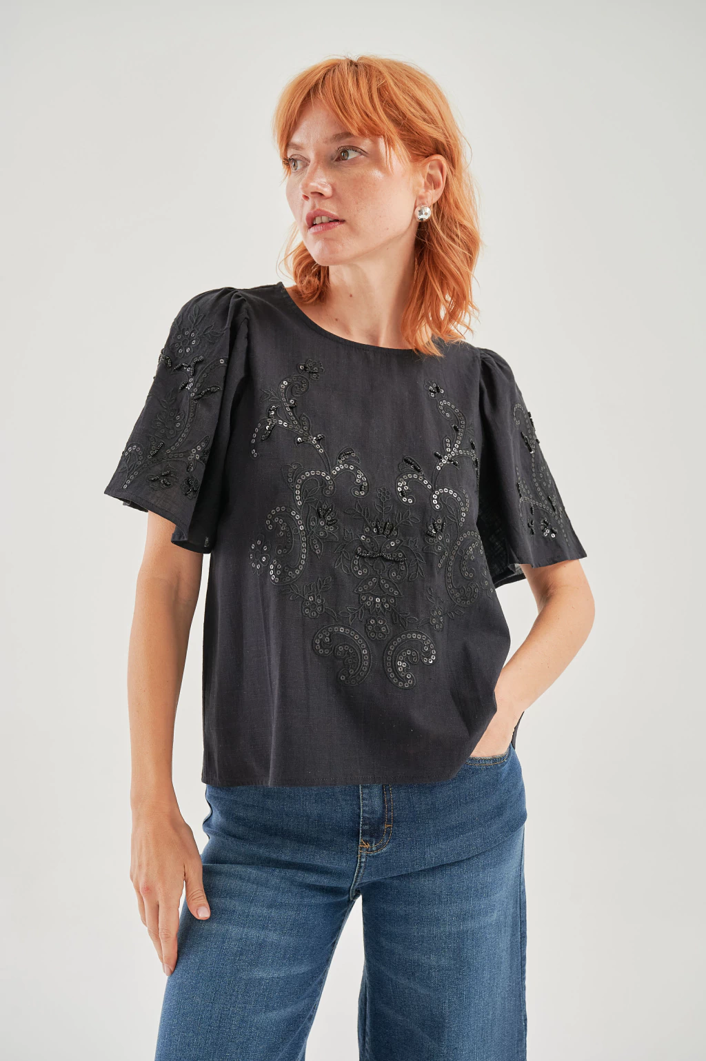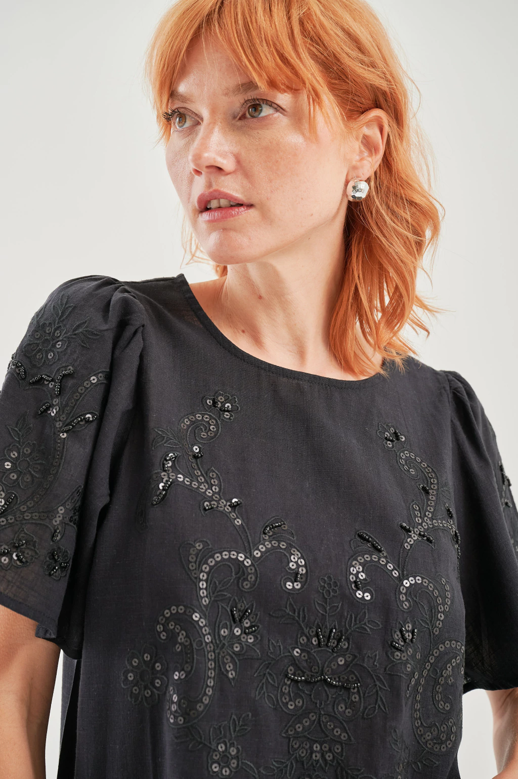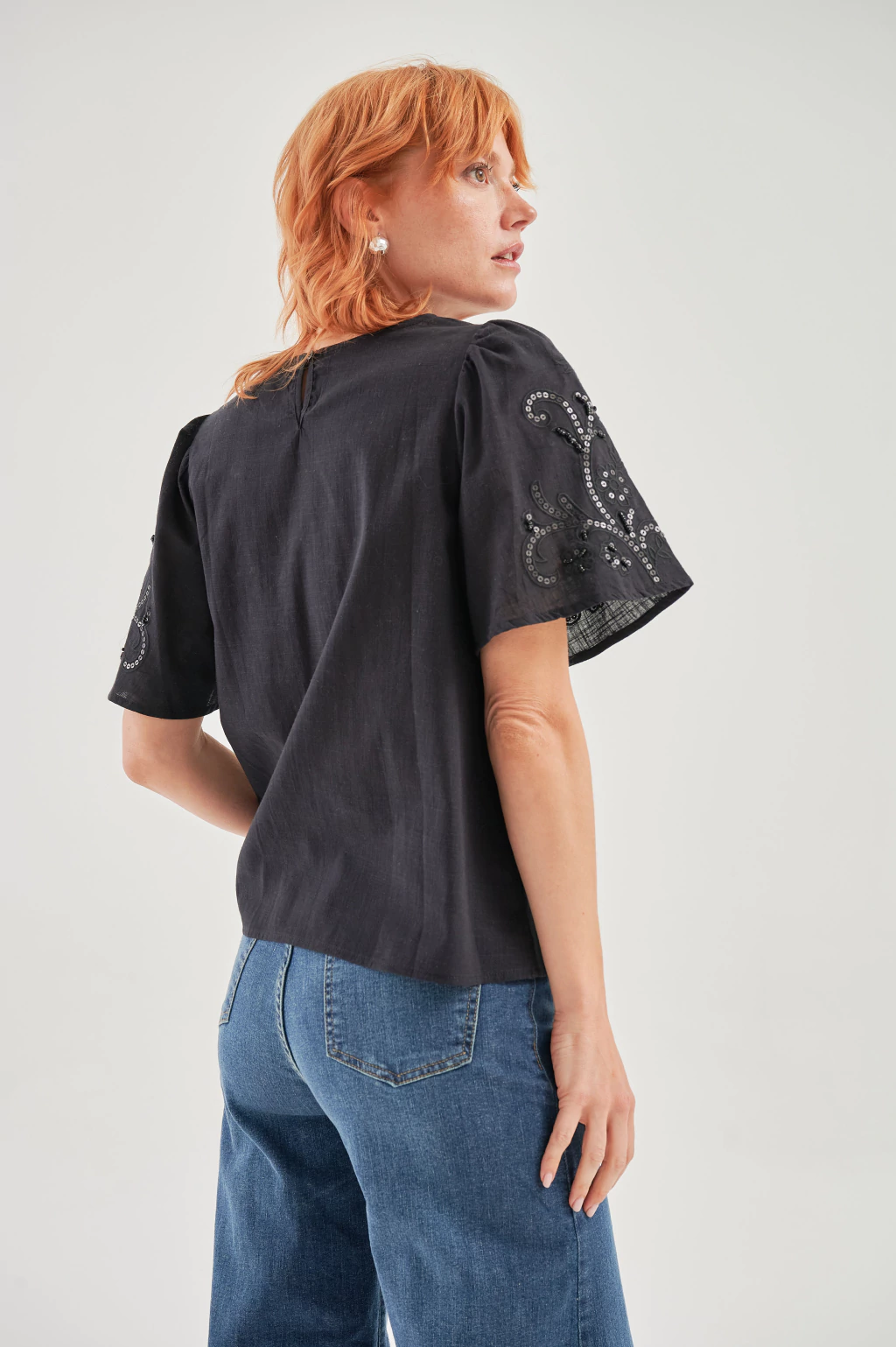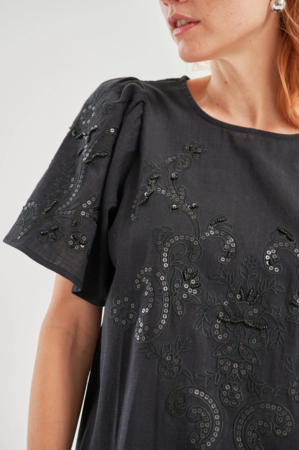 Descripción: Ca511 Blusa imperio con un elegante toque de lentejuelas que le aporta brillo y sofisticación. Su corte imperio resalta la figura de manera favorecedora, mientras que los detalles en lentejuelas añaden un toque chic y moderno. Perfecta para ocasiones especiales o para darle un toque de glamour a tu look diario.