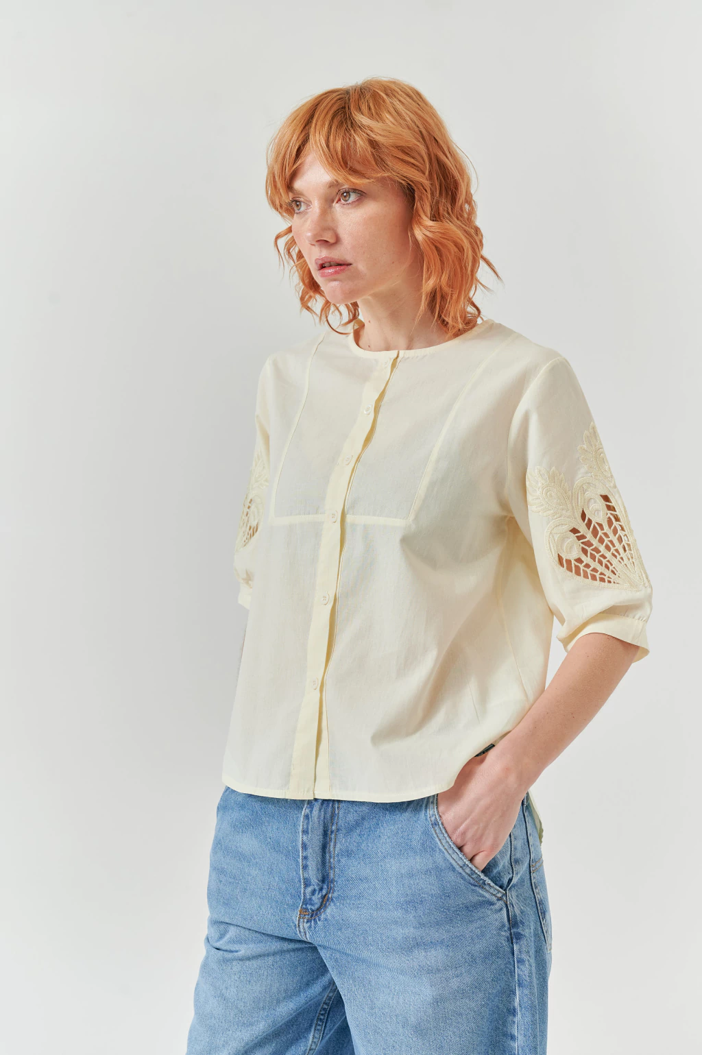Descubrí esta camisa de poplin con mangas cortas y detalles calados que aportan un toque delicado y moderno.