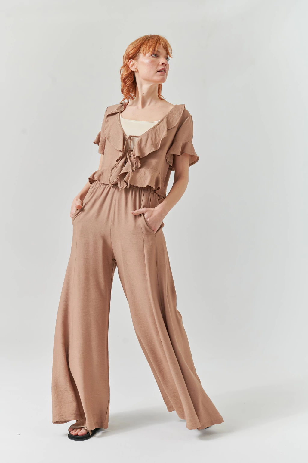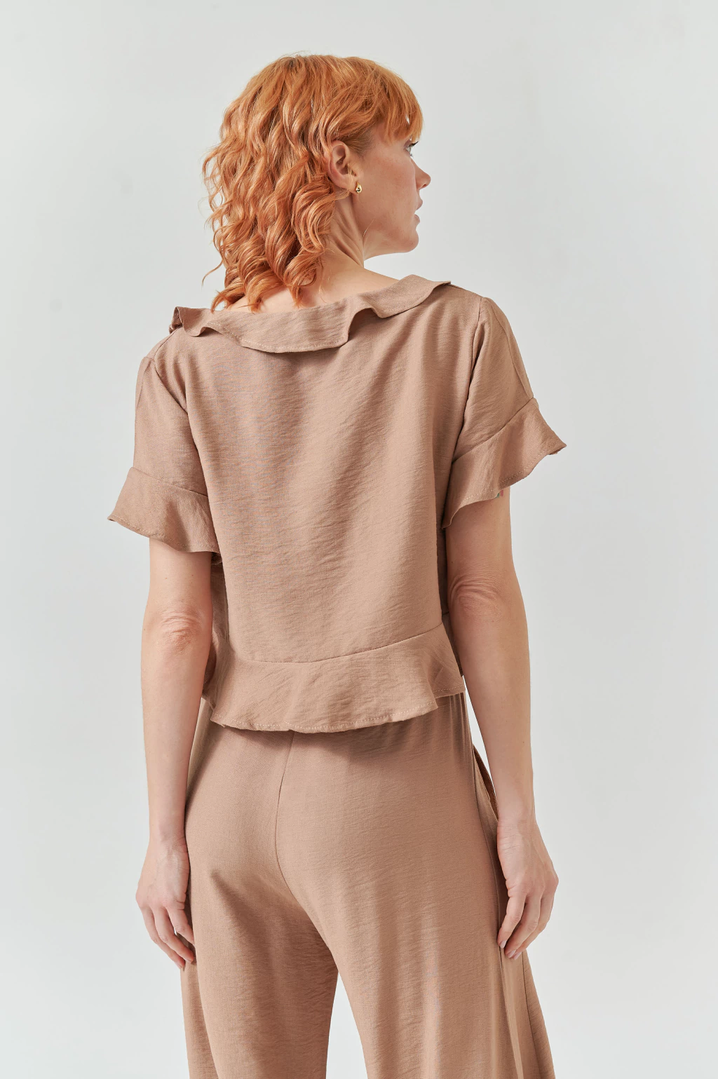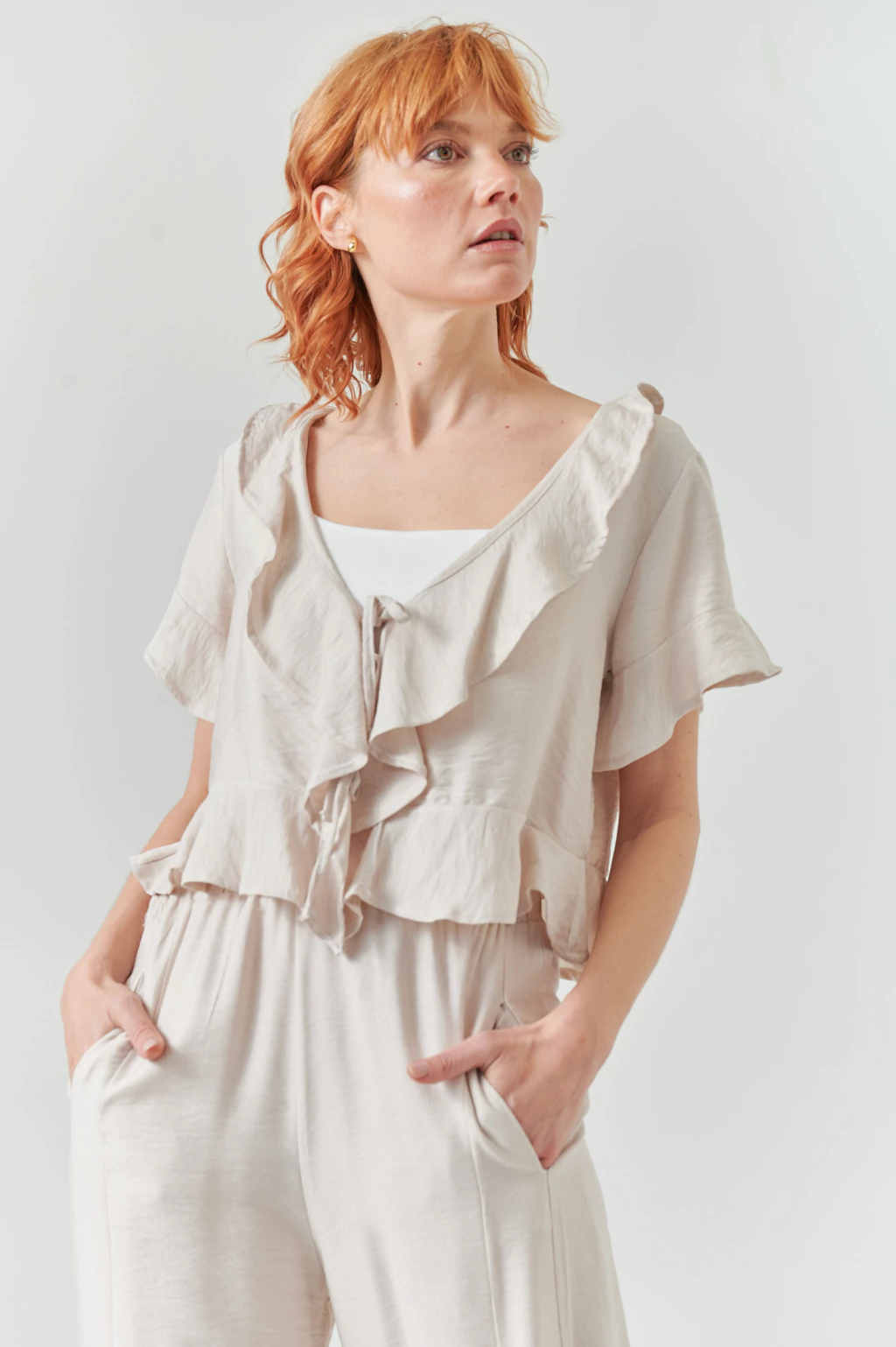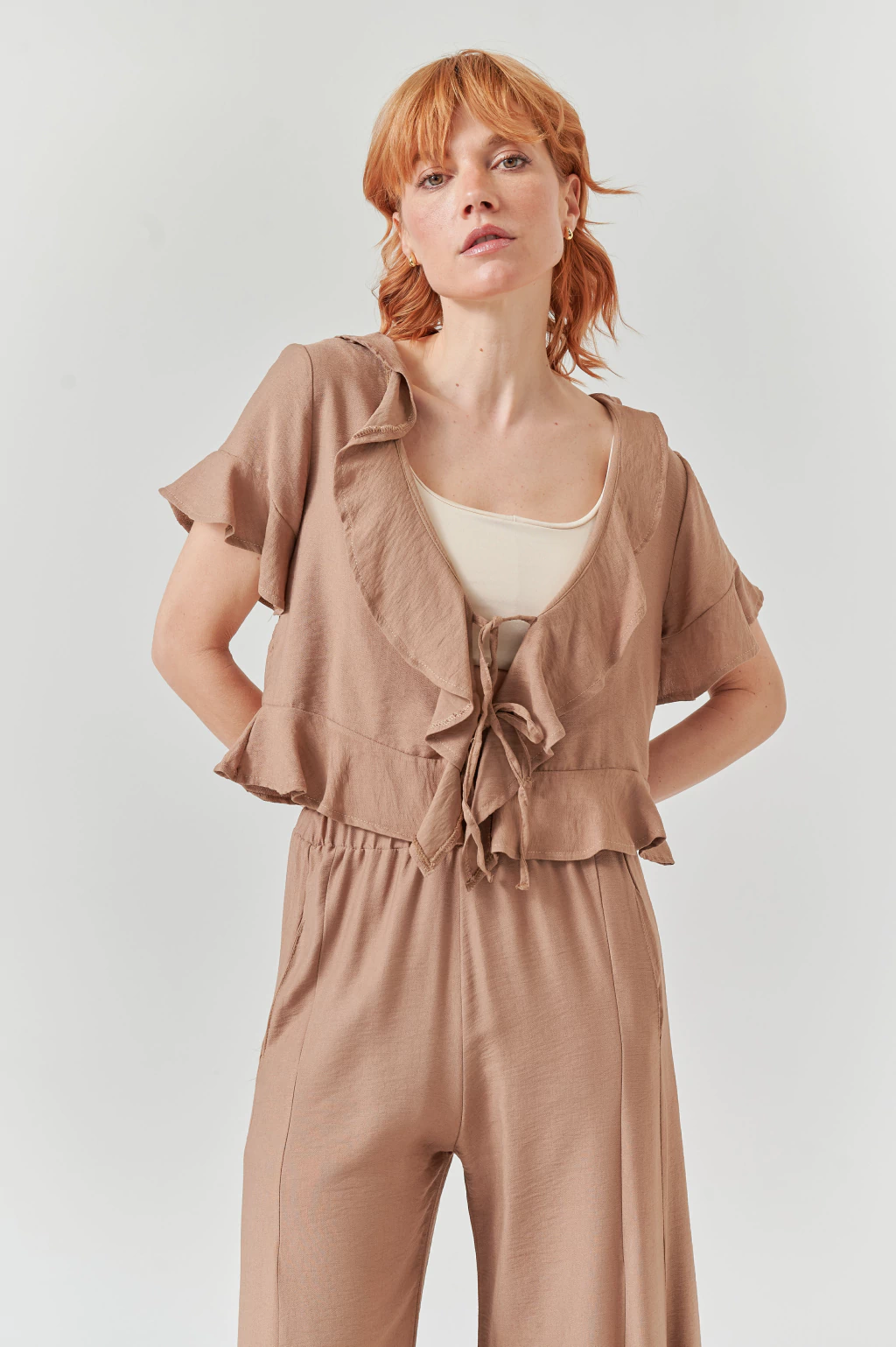 Camisa Bell Madrid: elegancia y frescura en un solo diseño. Esta camisa de crepé con mangas cortas y volados es perfecta para quienes buscan un estilo delicado y femenino. Su detalle distintivo son los dos nudos en la parte delantera, que aportan un toque moderno y original.