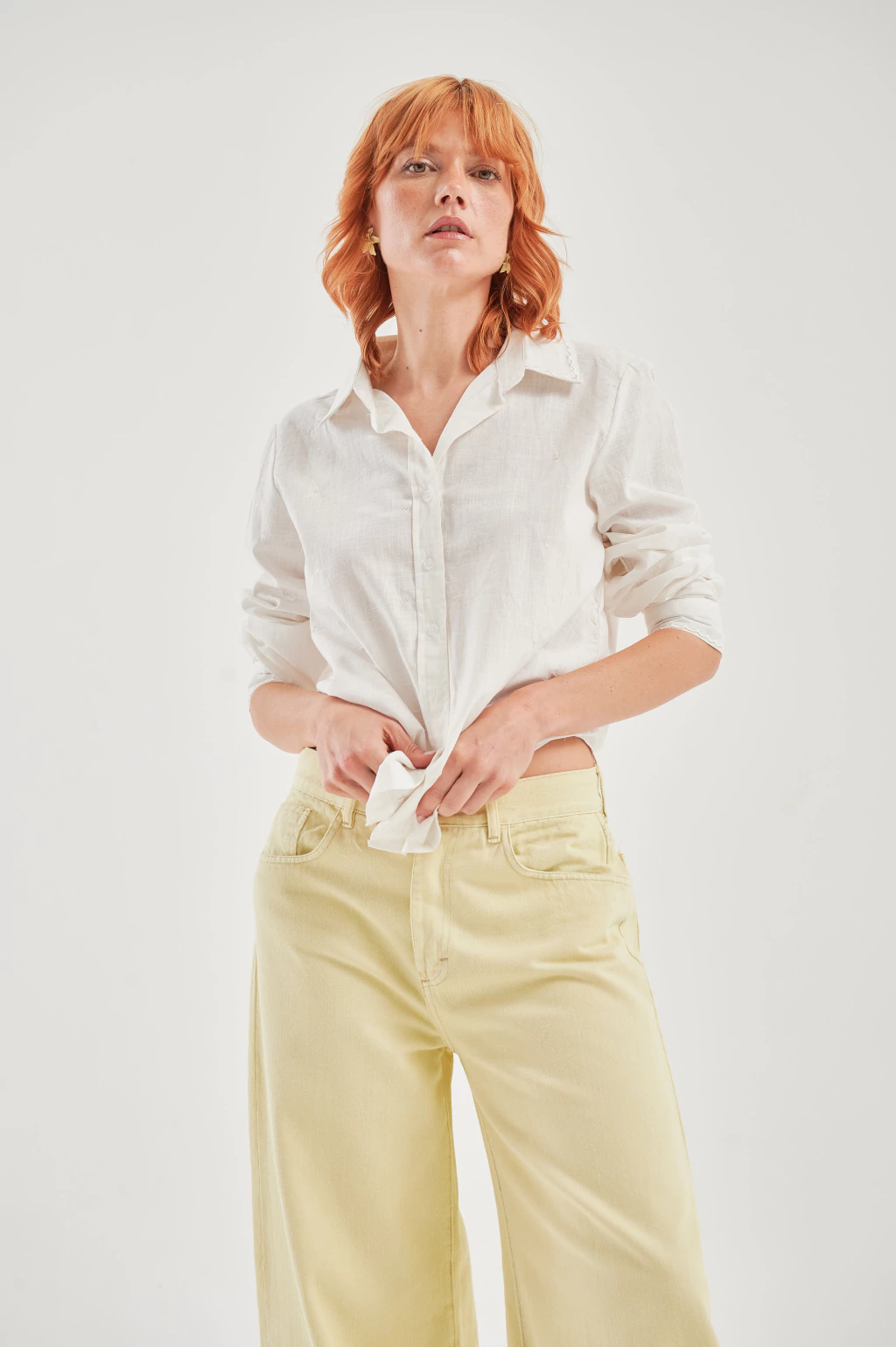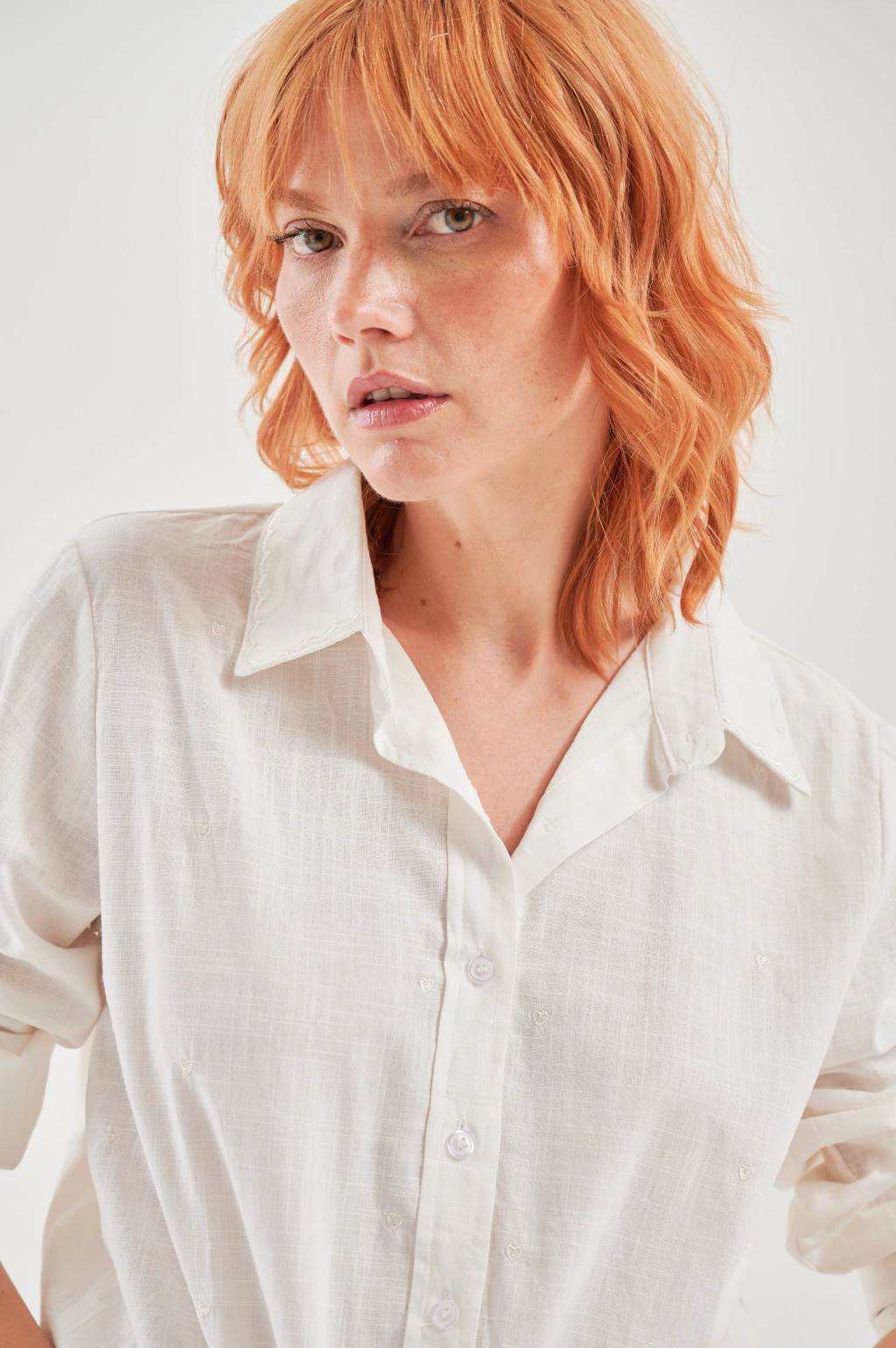 CAMISA CLASSIC LOVE Descubrí la elegancia de nuestra camisa clásica de lino liviano, perfecta para cualquier ocasión. Esta prenda de mangas largas destaca por sus delicados corazones bordados en tono a la tela, aportando un toque sutil y romántico.