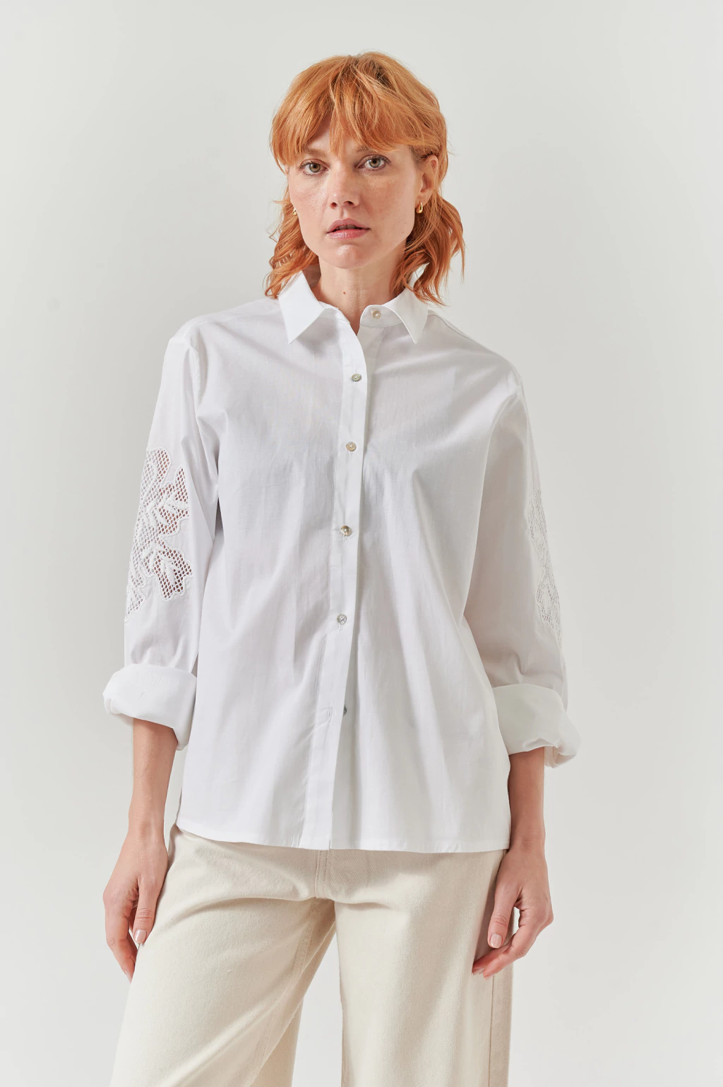 Descubrí la elegancia y comodidad de esta camisa de poplin elastizada con mangas largas. Su delicado detalle calado en las mangas le aporta un toque femenino y sofisticado.