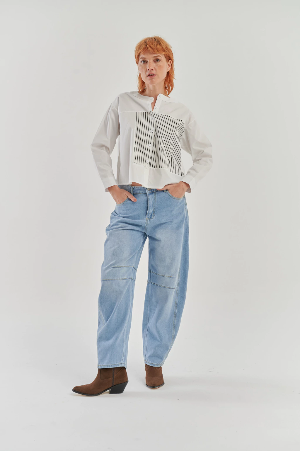 Esta camisa de manga larga destaca por su diseño sencillo con un detalle de líneas negras que le da un toque único y moderno.
