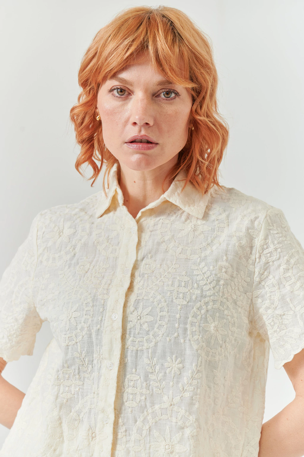 Descubrí la Camisa Petra, confeccionada en broderie con mangas cortas, ideal para lucir un look fresco y sofisticado. Su color preta la convierte en una prenda versátil que podés combinar fácilmente. ¡Armá un conjunto perfecto con el Short Preta!
