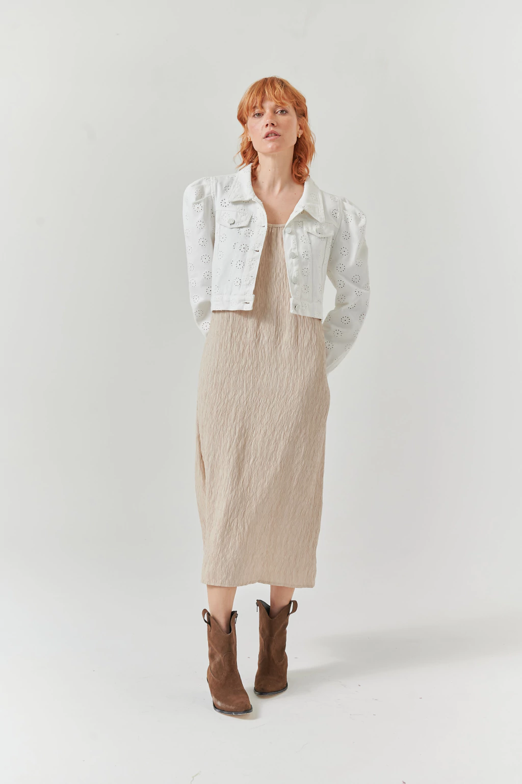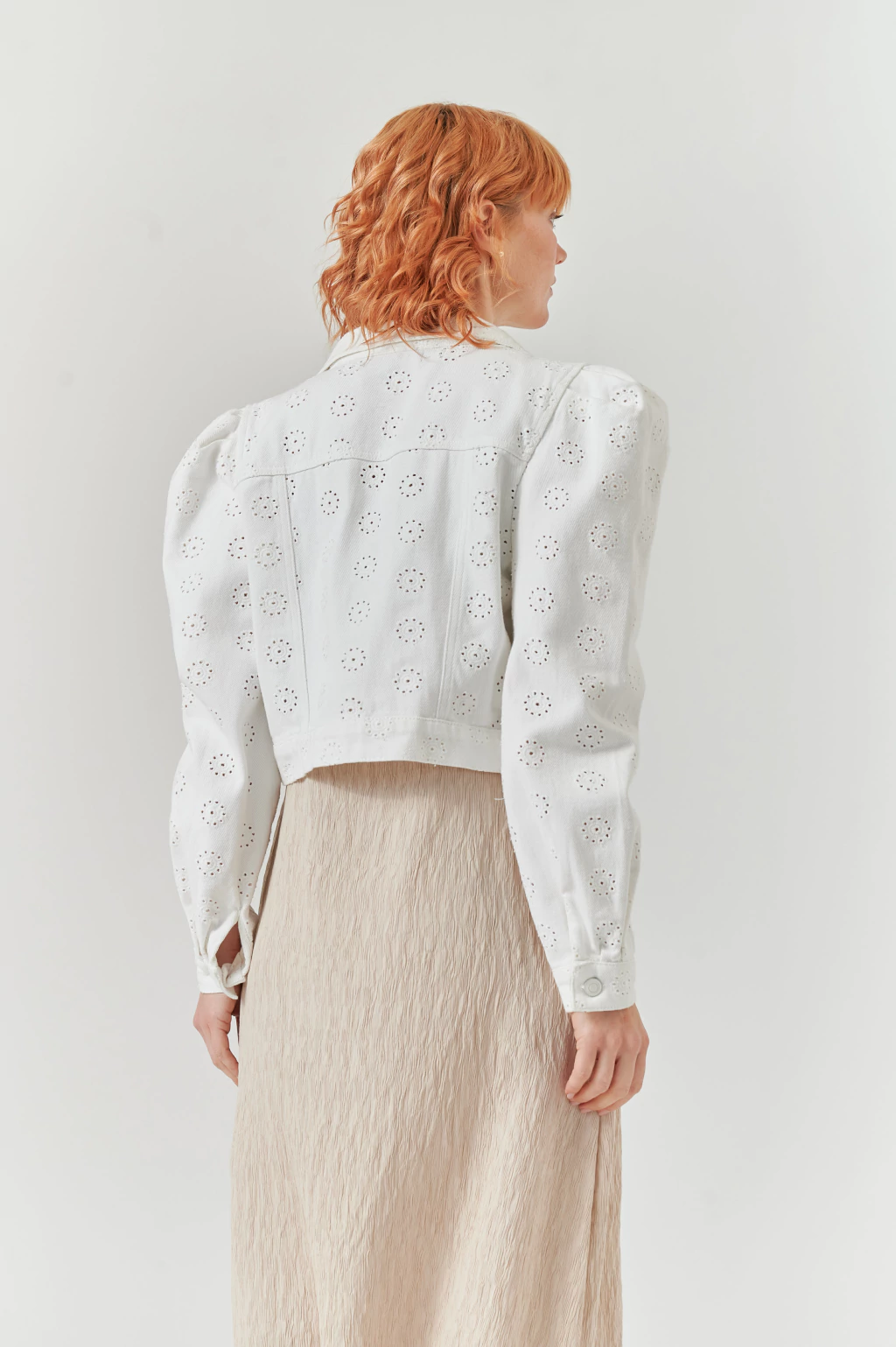 CAMPERA CUTE: elegancia y estilo en cada detalle. Esta campera corta de gabardina se destaca por sus detalles calados y la delicada manga princesa, que aportan un toque femenino y sofisticado