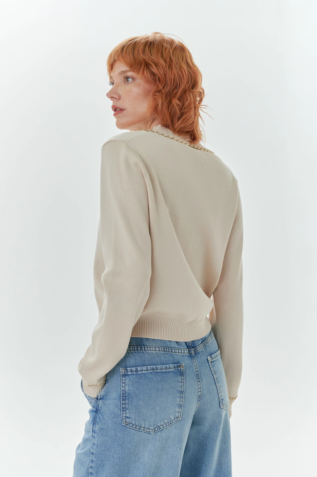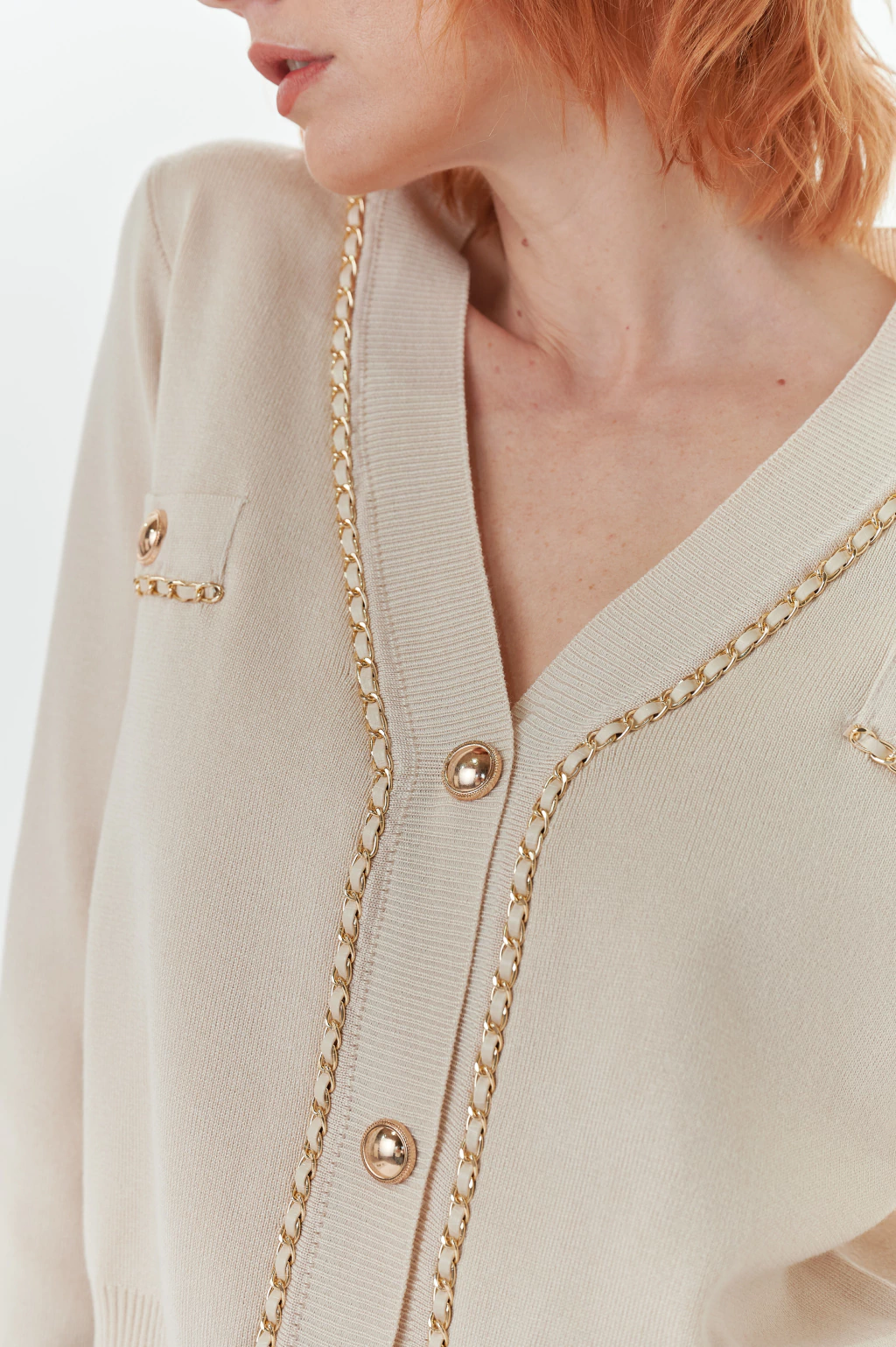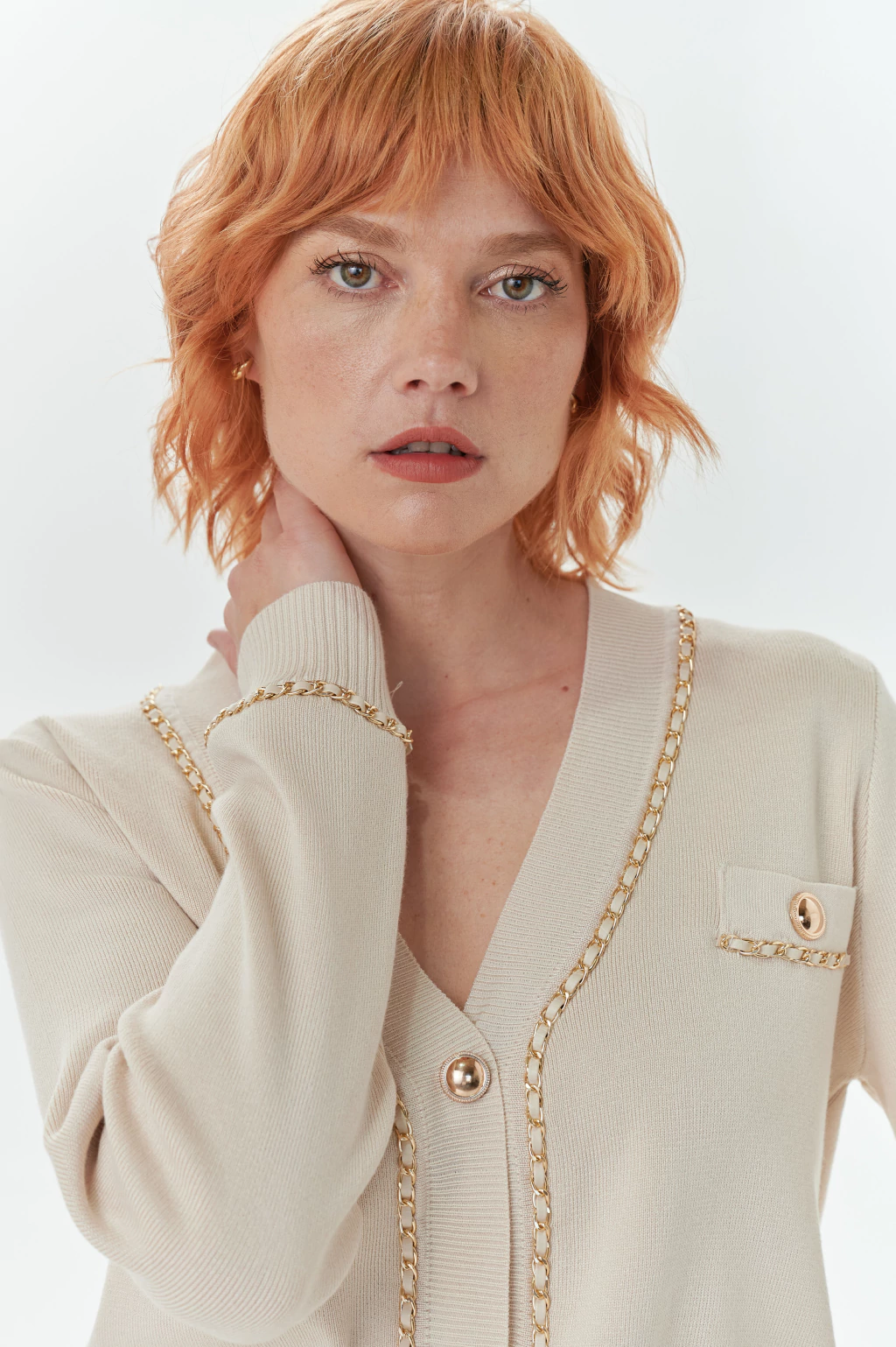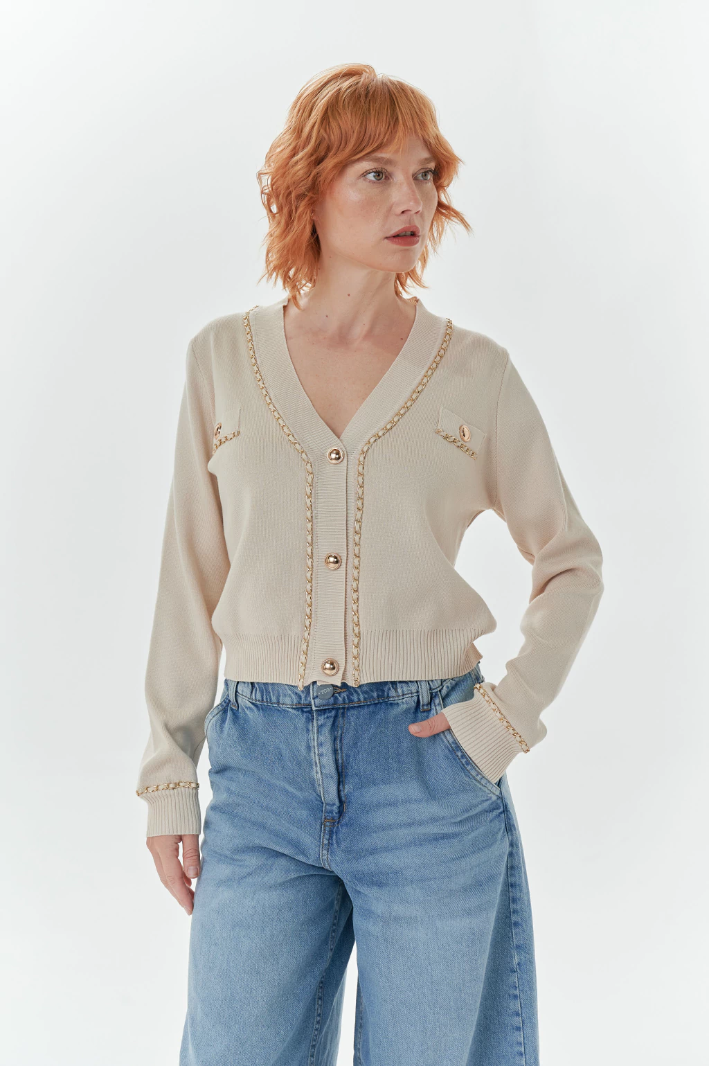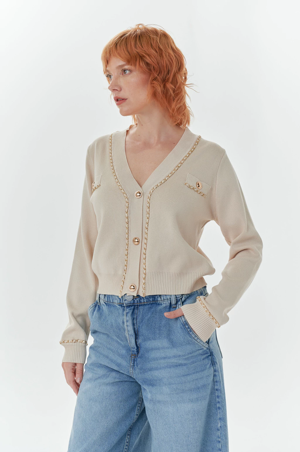 Descubre el Cardigan Coco Chan, una prenda delicada que resalta tu estilo con su detalle encadenado y botones dorados. Su diseño atemporal lo convierte en un aliado perfecto para cualquier ocasión.