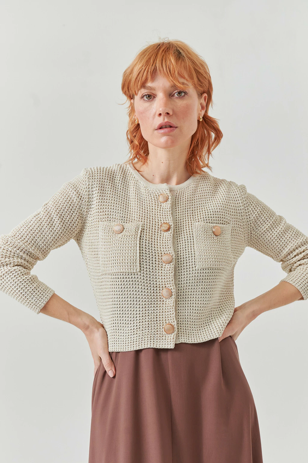 CARDIGAN COCO HONEY SUMMER es la prenda ideal para esta temporada. Su exclusivo trazado estilo panal aporta textura y distinción, mientras que los detalles en botones dorados le dan un toque de elegancia sutil. Disponible en talles S y M, en un color único que combina con todo.