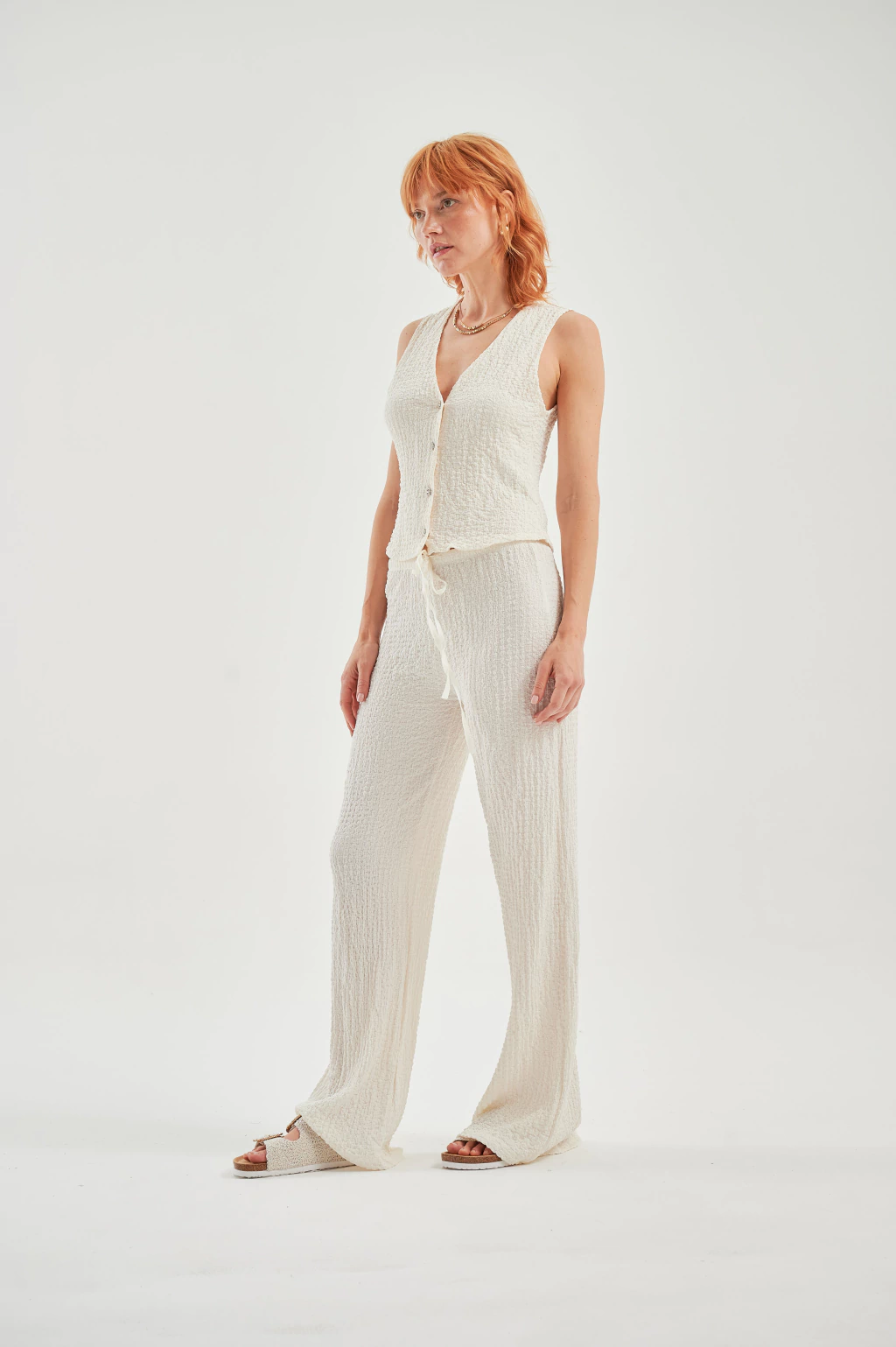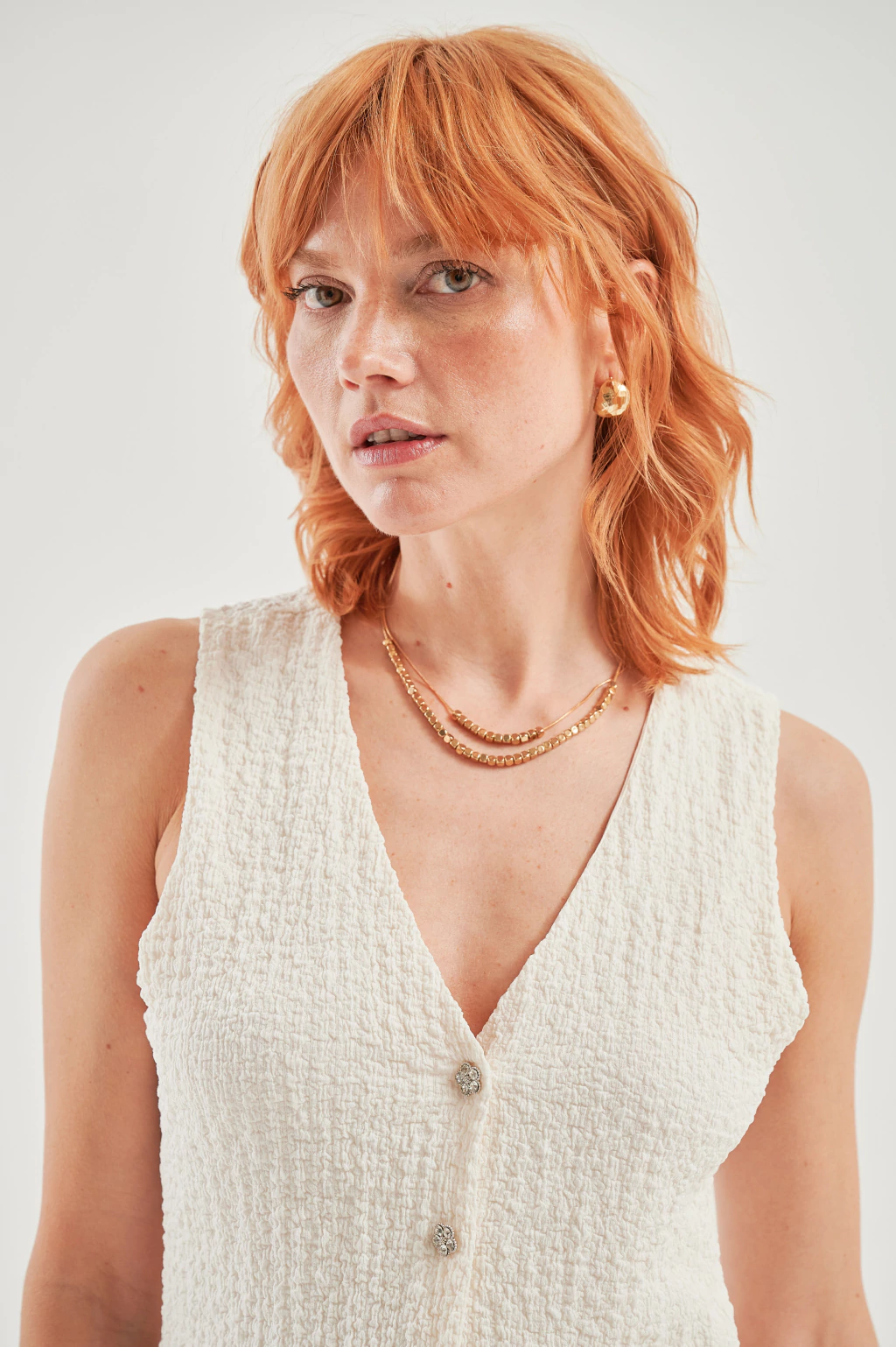 Descubrí el Chaleco Crinky, una prenda esencial para tu guardarropa. Confeccionado en bambula lisa, presenta un delicado escote en V y botones en forma de flor que aportan un toque femenino y sofisticado.