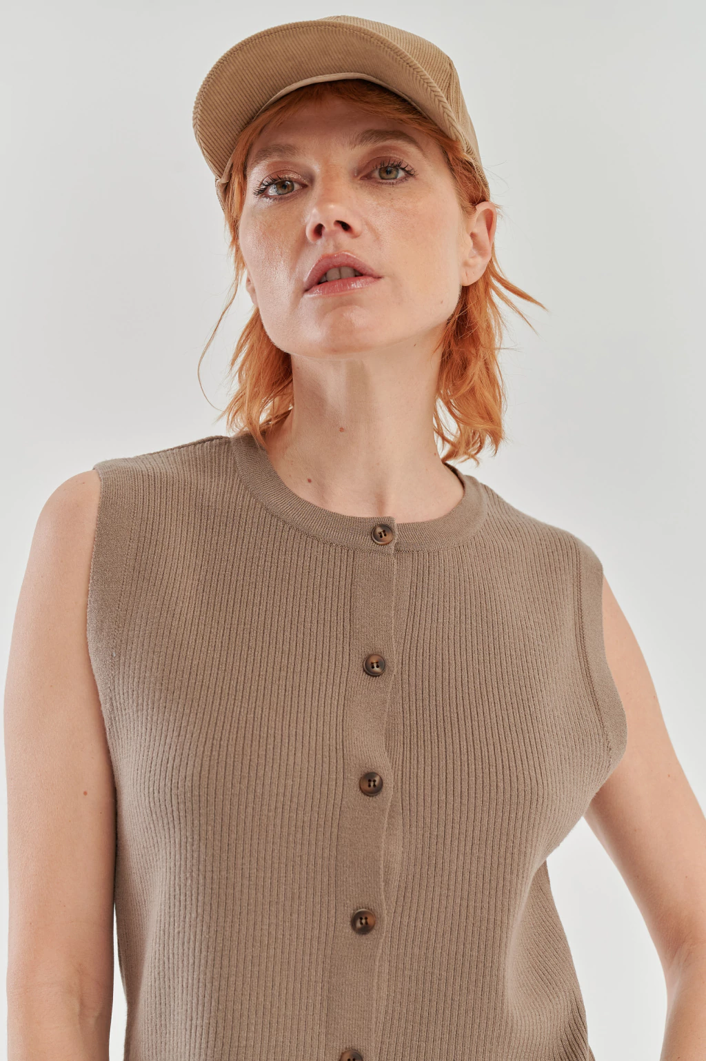Descubre el CHALECO DE MORLEY CON BOTONES en tonos marrones, una prenda muy delicada y perfecta para cualquier ocasión. Con un diseño atemporal, este chaleco es ideal para combinar con tus outfits favoritos.