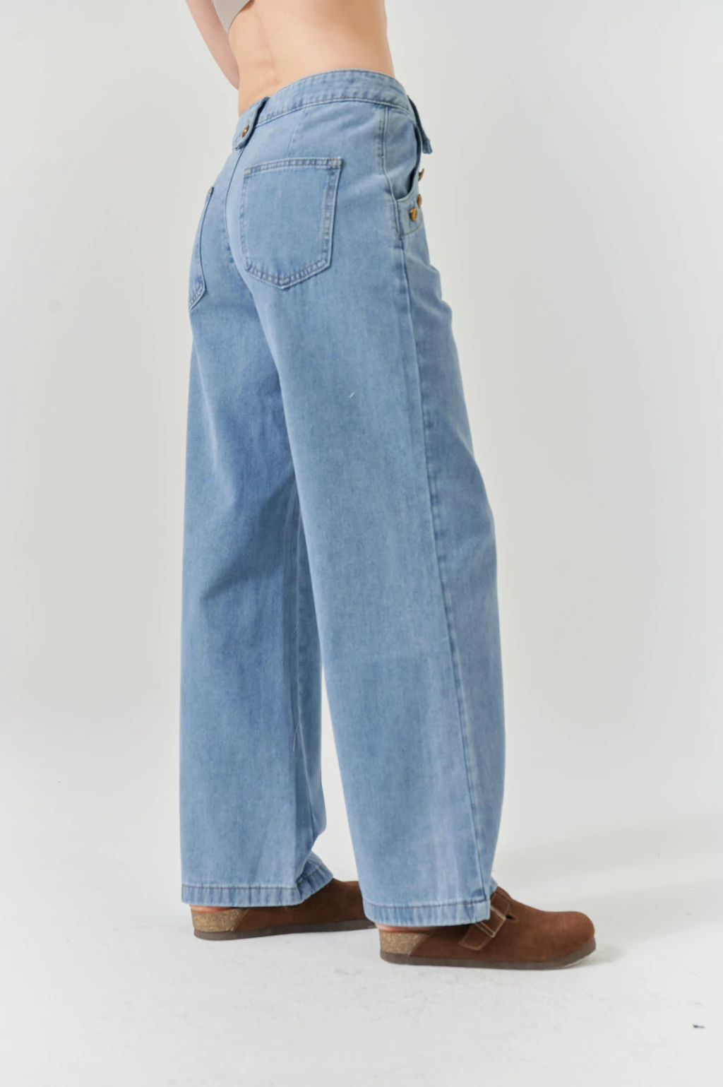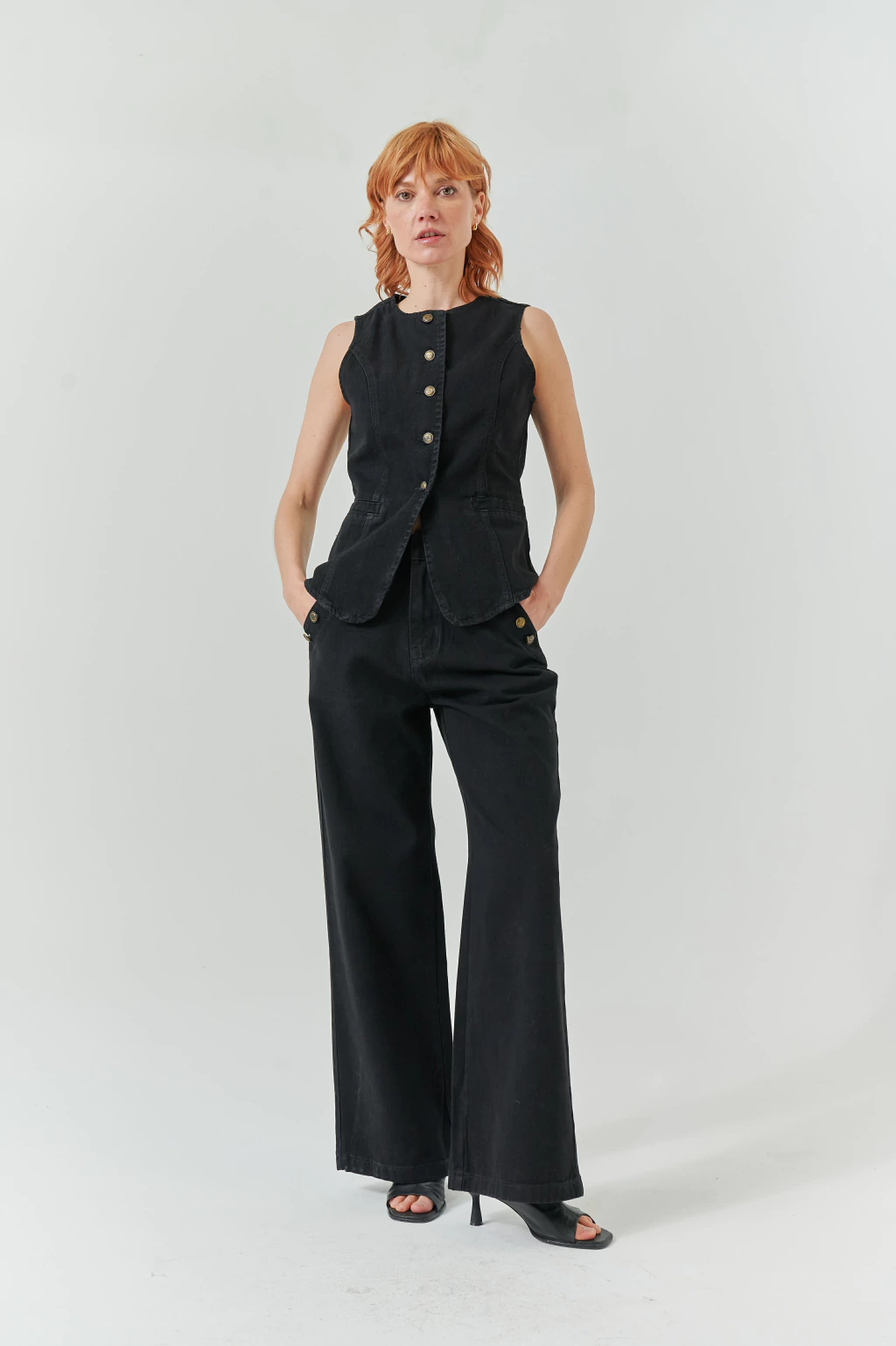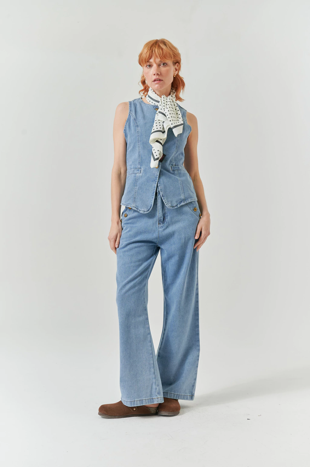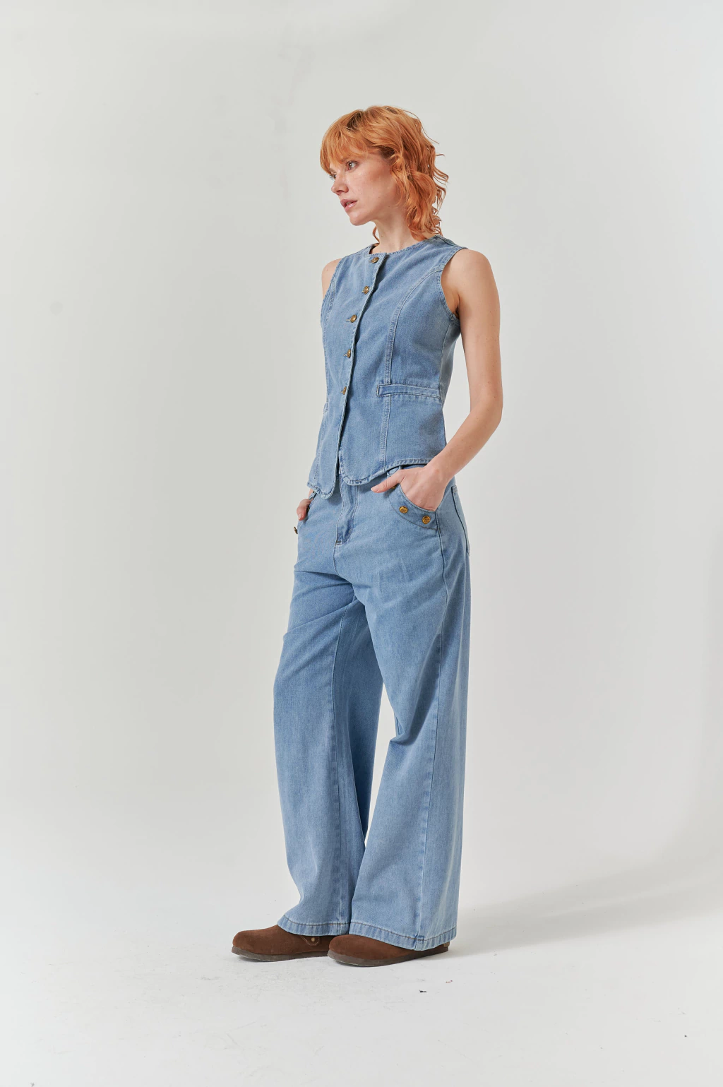 Este conjunto incluye un chaleco de jean entallado con cuello redondo cerrado, que realza tu figura con delicadeza. Combínalo con el jean wide leg, que destaca por su detalle de botones en los bolsillos, aportando un toque moderno y único.
