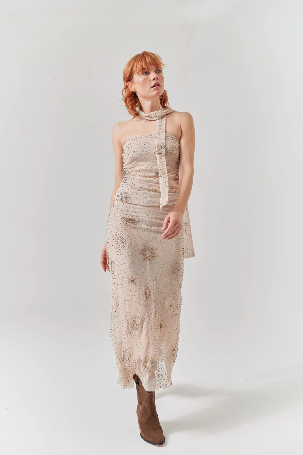 FALDA AURORA: una falda larga de tul con delicados detalles de mostacillas que aportan un brillo único y sutil.