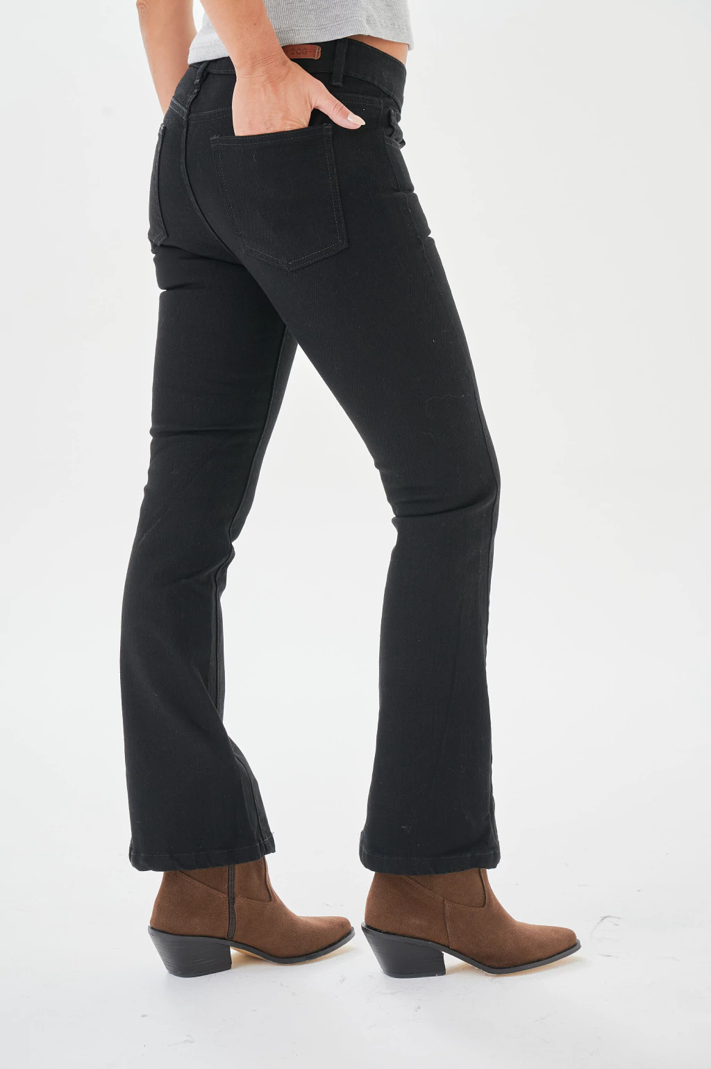 Descubre el JEAN negro ELASTIZADO CON MPIERTA ANCHA EN PANTORRILLA, una prenda que combina comodidad y estilo. Su moldería flare se adapta perfectamente a tu figura, brindando un look moderno y sofisticado. Ideal para cualquier ocasión, desde un día en la oficina hasta una salida con amigos.