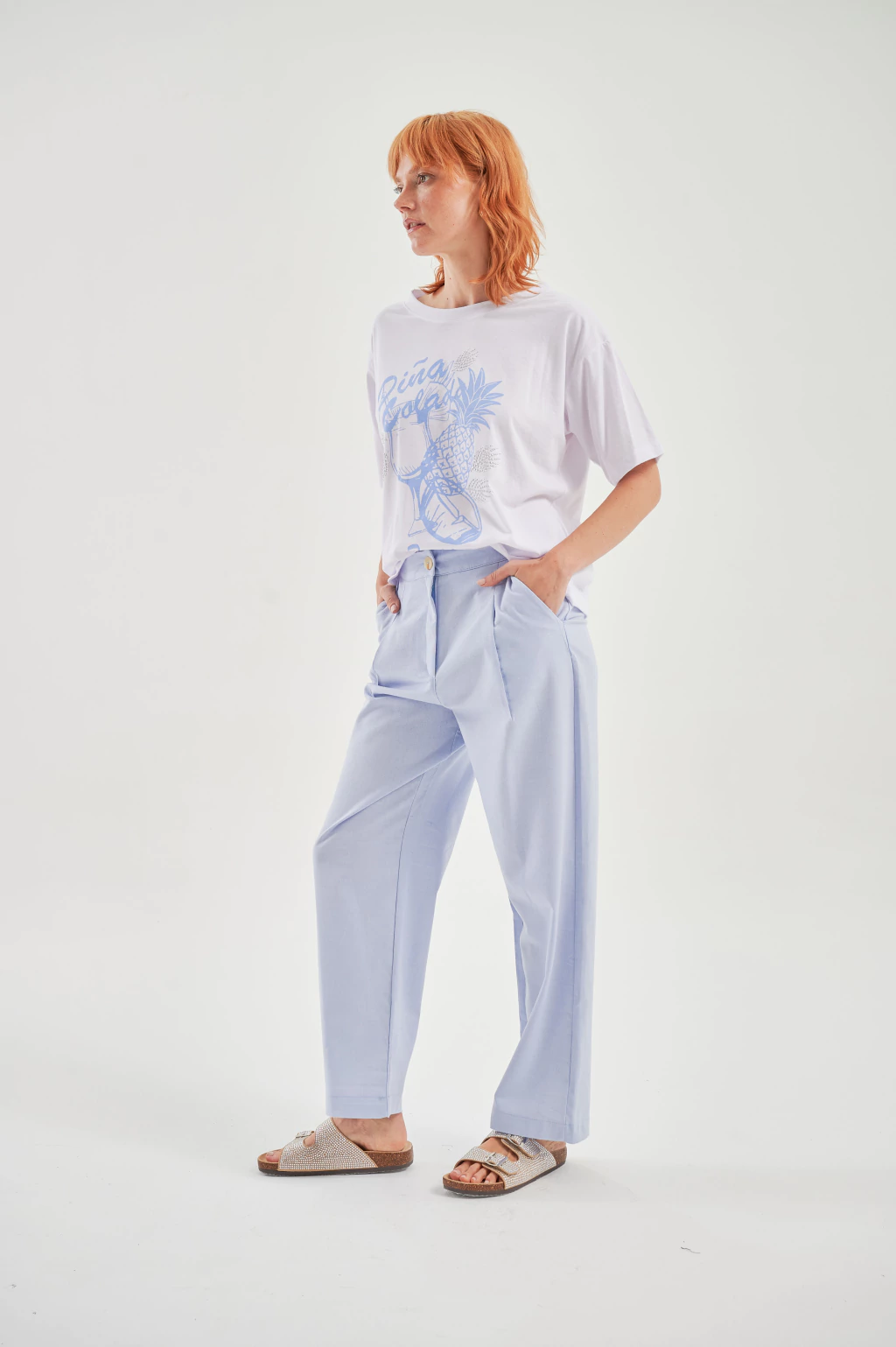 Pantalón Bahamas Lino, una prenda imprescindible para quienes buscan elegancia y frescura en su vestuario. Con moldería recta, este pantalón cuenta con pinzas en la cintura que realzan la silueta y dos bolsillos prácticos. Disponible en colores negro, celeste y natural, y talles S y M, es ideal para tus días de verano o para un look sofisticado y cómodo.