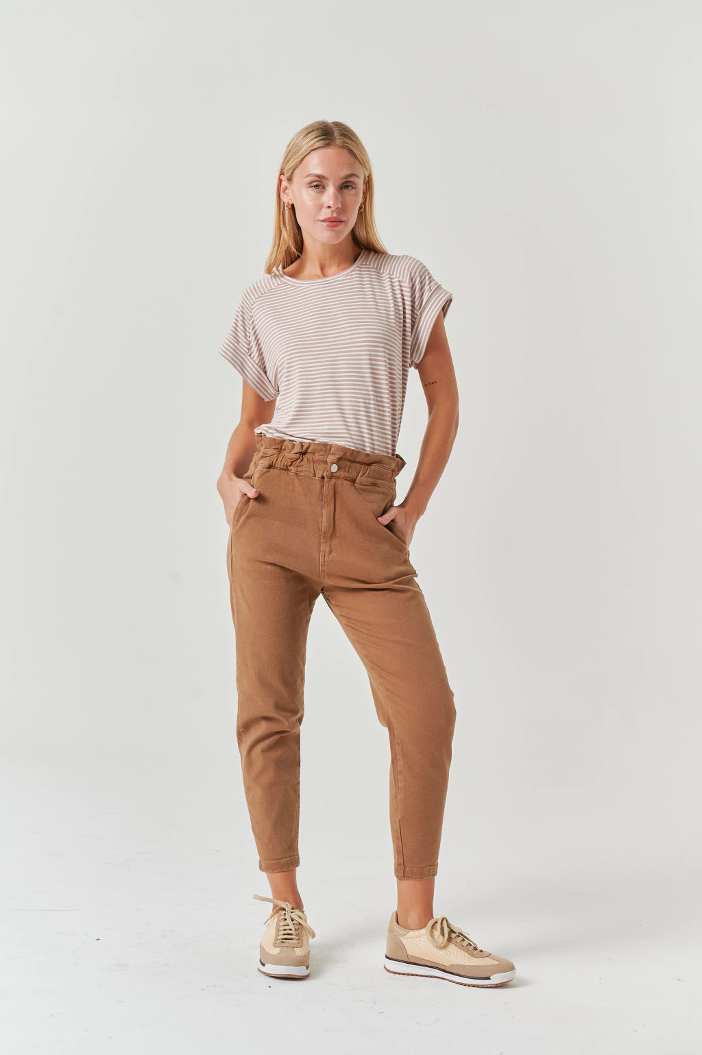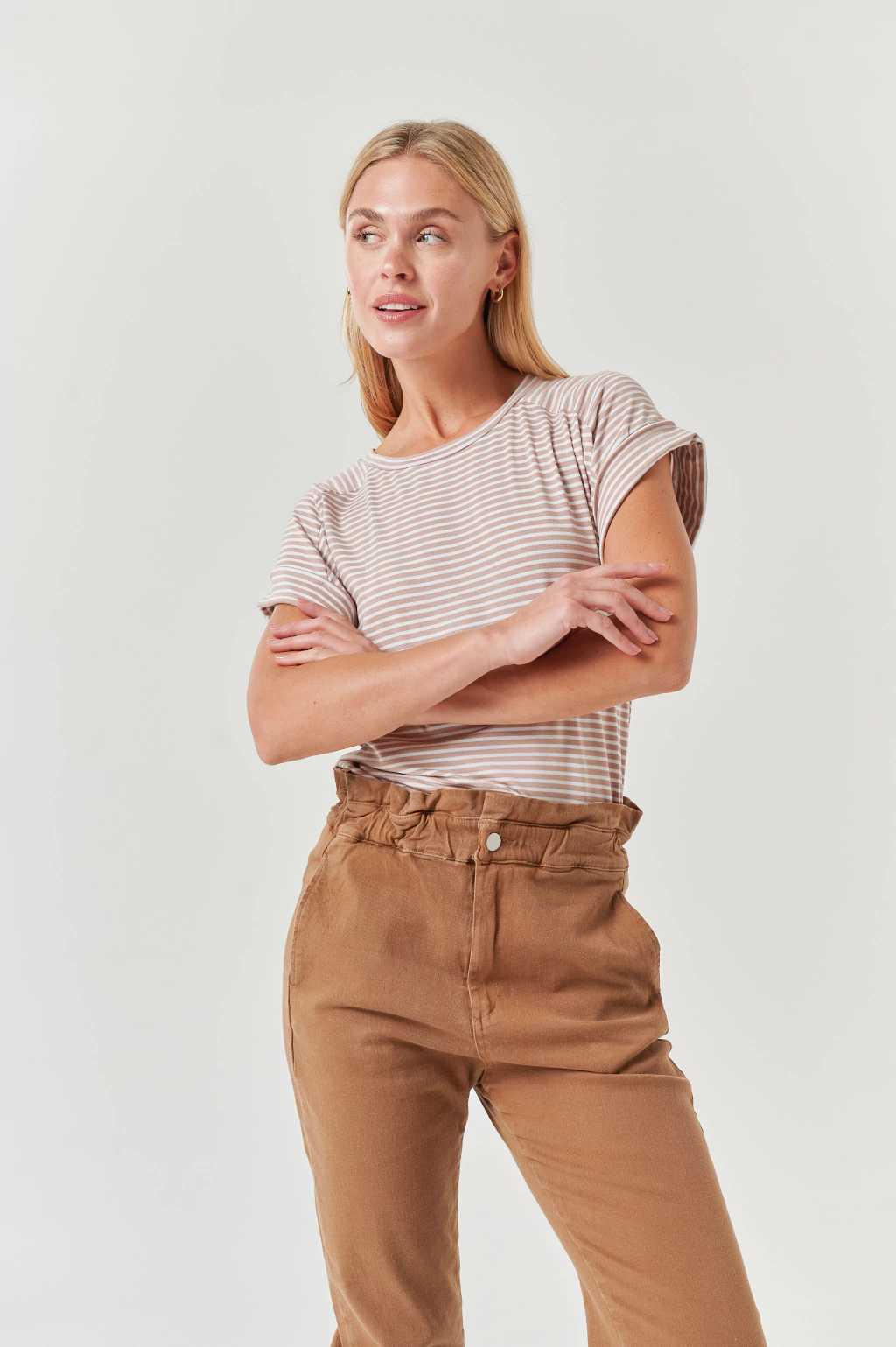 Remera onfeccionada en suave algodón y lycra para máxima comodidad. Su diseño a rayas en colores negro, blanco y beige, junto a sus mangas japonesas, le dan un toque sofisticado y moderno.