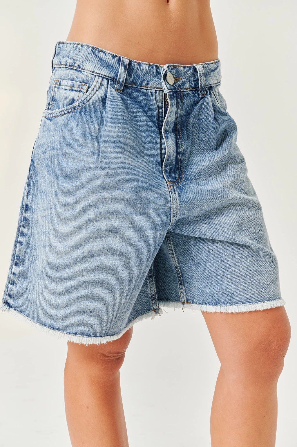 SHORT BERMUDA JEAN CON PINZAS Descubrí el clásico short de jean que no puede faltar en tu placard. Con un pequeño detalle de desflecado y pinzas que realzan la silueta, este short bermuda ofrece comodidad y estilo en cada uso.
