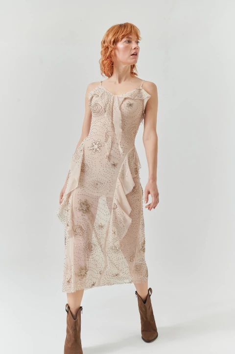 Este vestido largo de TUL, adornado con finas mostacillas, destaca por su diseño muy delicado, ideal para ocasiones especiales.