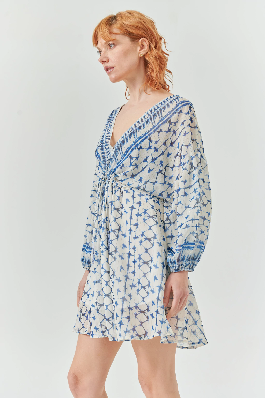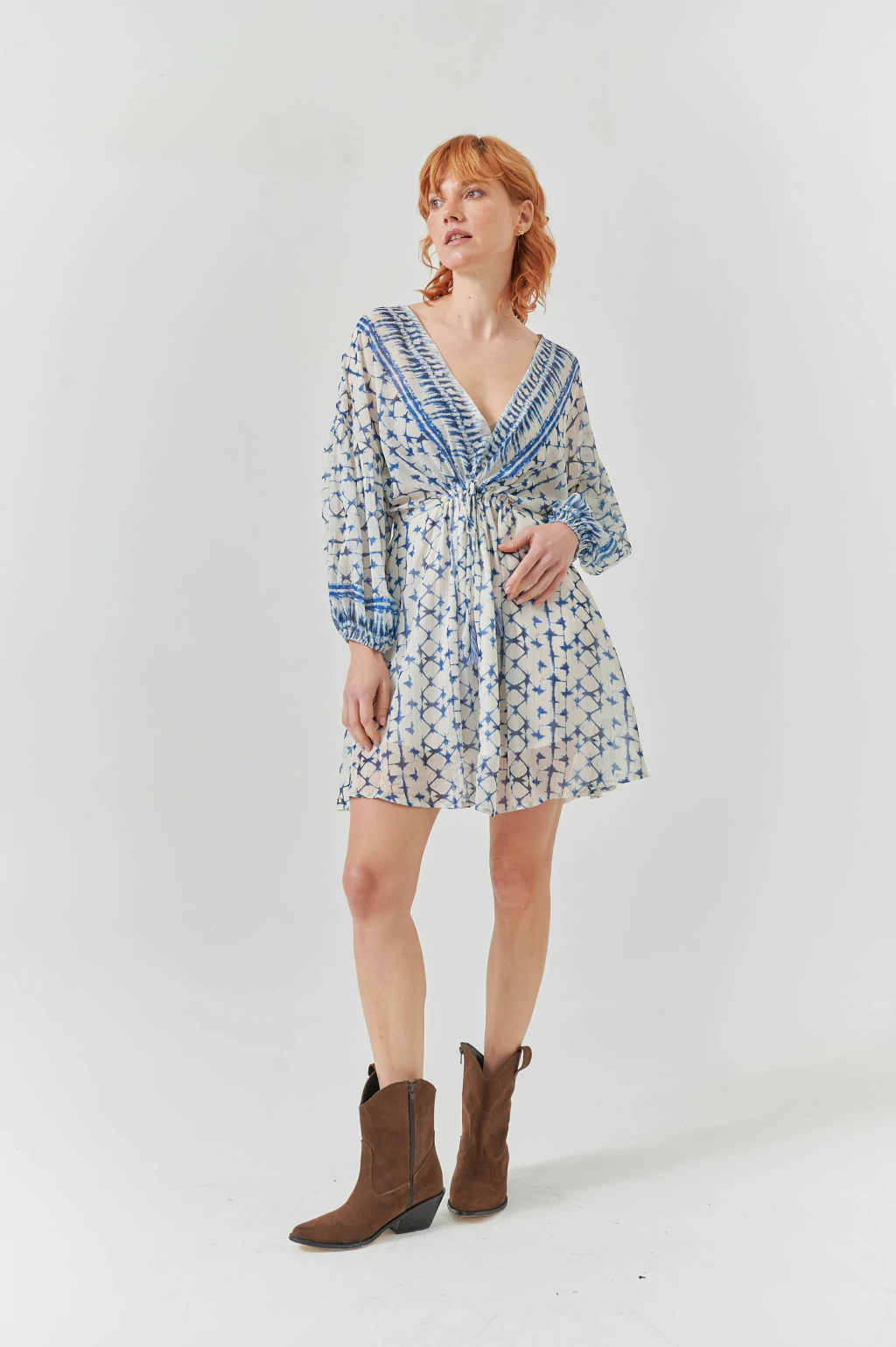 Descubrí el VESTIDO TAJ MAHAL, un hermoso vestido a la rodilla que realza tu figura con un delicado escote en V y frunce en sus mangas largas.